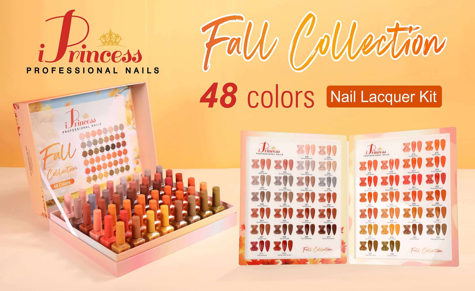 iPrincess Fall Collection – a professional Kit with 48 gel - reg & powder autumn shades, complete with 1 sample books and 1 elegant display box. Perfect for creating salon-quality, long-lasting nail designs this season.