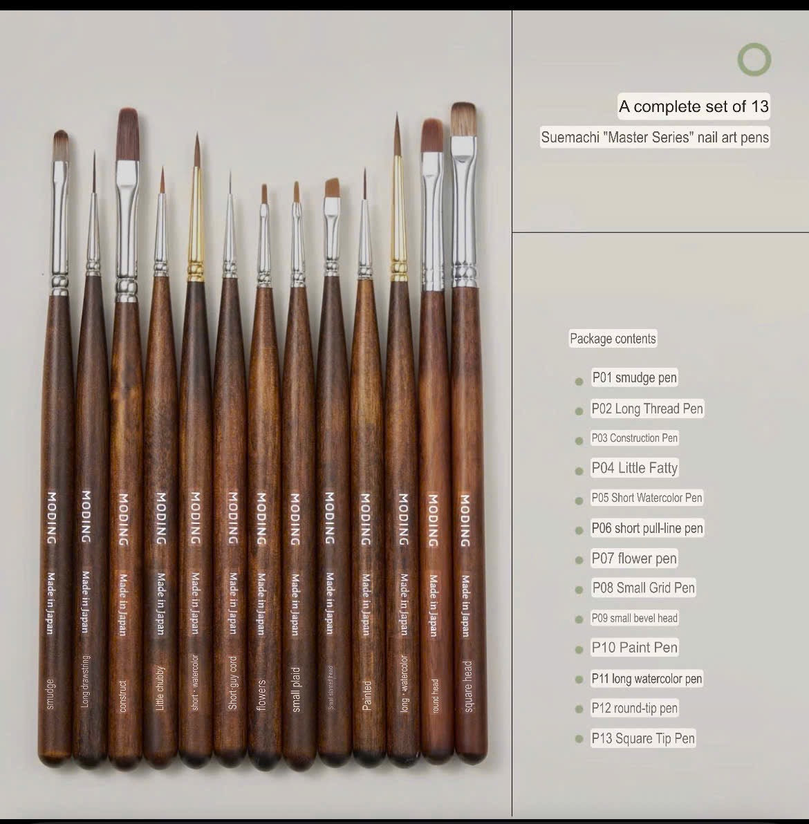 A complete professional brush collection designed for precision nail art. The set includes 13 different brushes, each crafted with fine bristles and durable wooden handles for perfect control and long-lasting use.